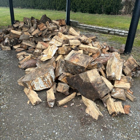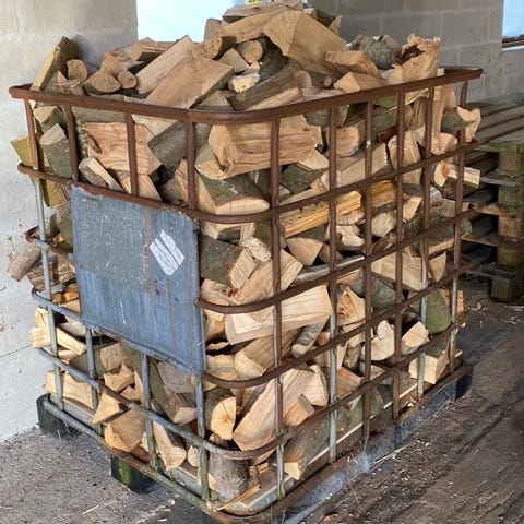 2 bure med nykløvet brænde af forskellige træsorter. Noget er klart til at bruge allerede om 2-3 mdr og alt er fyrings klart om 6 måneder.