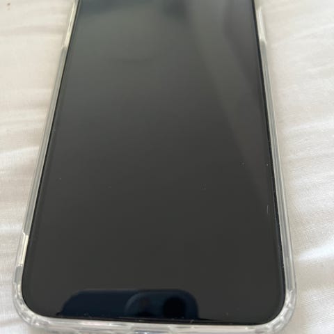 Modellen har monteret pansercover på skærmen, og der er små ridser og en revne hen over midten.