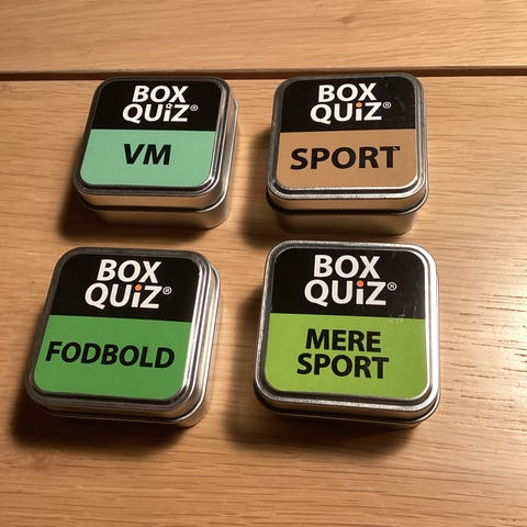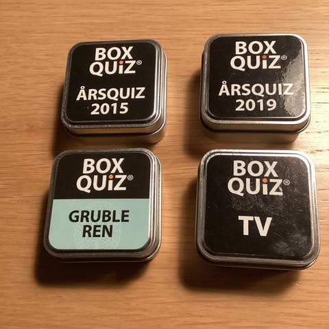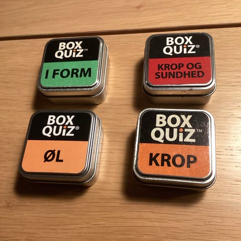 Box Quiz quizspil i æske. Sæt med fire forskellige temaer: Rejse, Ferie, Danmark og Nordisk mad. Hver metalæske indeholder quizkort med spørgsmål inden for det angivne emne. Velegnet som underholdning til fx familie, venner eller rejser, hvor der ønskes korte quizrunder med spørgsmål om geografi, ferieoplevelser, Danmark og nordisk madkultur.