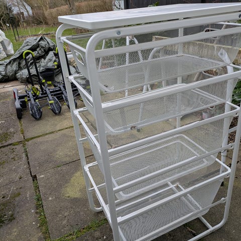 IKEA opbevaringsreol med trådkurve i hvid. Reolen består af en metalramme med flere udtrækkelige trådkurve og en fast topplade. Egnet til opbevaring i fx garderobe, bryggers, depotrum eller kontor, hvor der er behov for overskuelig organisering af tøj, tekstiler eller andre mindre genstande.
