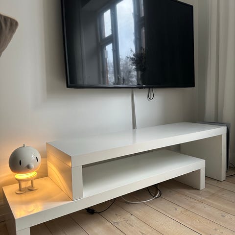 Ry tvbord i mat hvid med skab og skuffe. Den er flot og velholdt uden tydelige brugsspor.