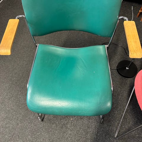 Info: Blankt medestel og sort læder på ryg, sæde og armlæn. Stolene er Fuldpolstret. Design, æstetik og med en god siddekomfort. Brug den for eksempel i som spisebordstol, rundt om et mødebord eller måske kontorstol. Stolene kan stables for let opbevaring, når de ikke er i brug.