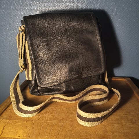 Tasken er udført i glat læder med justerbar skulderrem og metalspænder med Ted Baker-logo. Klassisk taskeform med frontklap og remme samt ekstra lomme på forsiden. Egnet som hverdagstaske eller arbejdstaske med plads til mindre personlige ejendele.