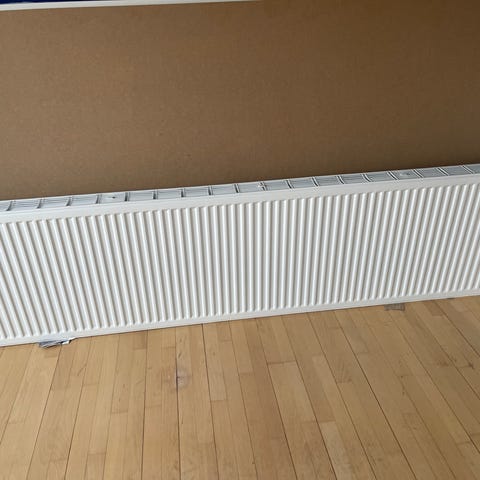 2 stk. H30 x B260 x D9,5 cm. Hvide radiatorer med konvektionsrist fra 2008. Radiatorene er beregnet til montering langs væg og har lav højde, hvilket gør den velegnet under vinduer eller langs gulv. Den har integrerede konvektionsriste i toppen for bedre varmefordeling. Tilslutningsstudse er placeret i enderne. På billederne ses også en separat gulvbeslag med justerbar metalholder, som kan bruges til montering eller støtte af radiator eller lignende elementer. Mål på holderen fremgår af billedet med tommestok.