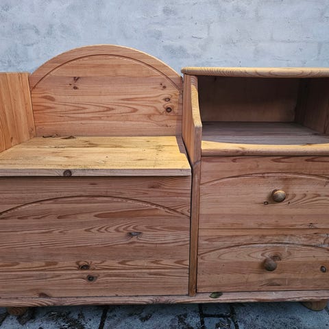 Entrésæt i massivt fyrretræ – spejl og bænk med skuffer