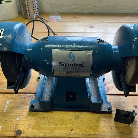 Scantool SC 175C bænksliber med en hjuldimension på 175 x 25 mm. Maskinen har en effekt på 440 W og kører ved 3000 omdrejninger pr. minut. Driftsspænding er 1x220/240V, 50 Hz. Bænksliberen er egnet til slibeopgaver i værksted eller hobbybrug, hvor der er behov for præcis slibning af metalemner og værktøj.sælges for Lions Club Hellerup