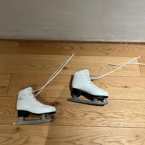 Spin kunstskøjter i hvid, størrelse 35. Klassisk model med snørelukning, høj støvle og sort hæl. Skøjterne har metal-klinger og polstret inderside for bedre komfort. Velegnet til børn eller mindre fødder til kunstskøjteløb eller fritidsskøjtning på is.