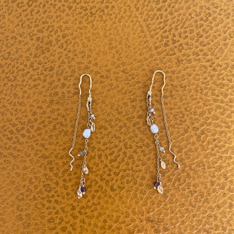 Maanesten øreringe til kvinde i sølv med perler. Øreringene har halvmåneformede vedhæng og flere små kæder med perler og små detaljer. Smykket er udført i sølv som hovedmateriale med perler som anden udsmykning. Velegnet som accessories til hverdag og fest.