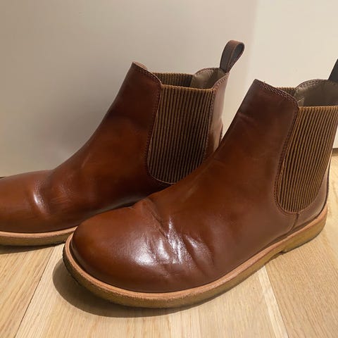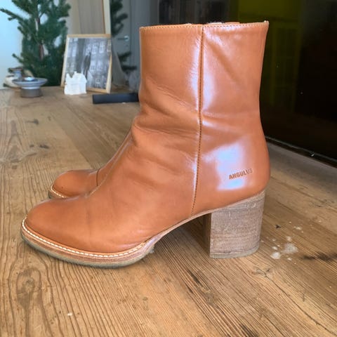 Kassiske Chelsea-støvler fra det danske mærke Angulus. Denne specifikke model er kendetegnet ved sin brede pasform, runde snude og de karakteristiske såler i rågummi.
