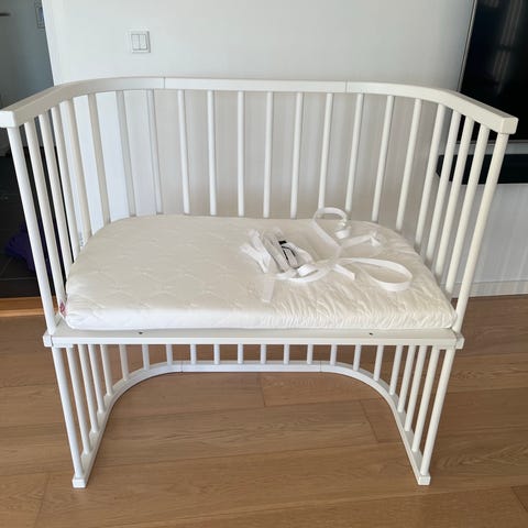 Der medfølger madras, topmadras, vådliggerlagen og tre stræklagener. Derudover medfølger et sidestykke, som aldrig har været brugt, en holder til uro, sengerand samt remme til at fastspænde sengen til forældresengen.