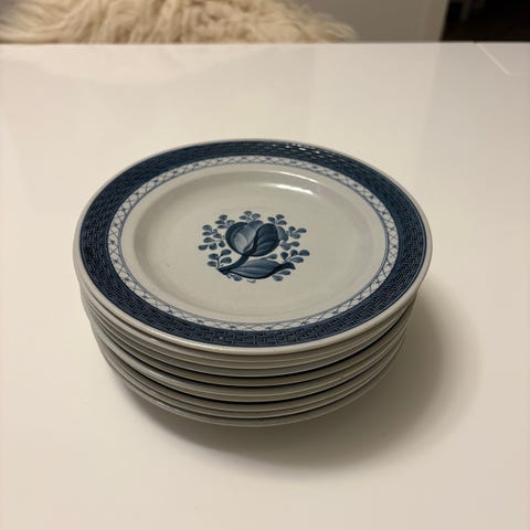 i det klassiske Tranquebar-mønster (blå fajance med kurveflet-kant og blomster i midten).