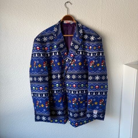 Opposuits jakkesæt med farverigt juleprint. Sættet består af jakke med flerfarvet mønster med julekugler og gran samt helt sorte bukser og et slips . Jakken har lilla foer og klassisk revers. Jakkesættet kan bruges til julefrokoster, temafester og andre lejligheder, hvor et festligt juleudtryk ønskes. Størrelse 60, XXL, brugt 2 gange og fremtræder stort set som nyt. Opposuit sættene er i virkelig god kvalitet, der kan holdene mange år og stadig være flotte. Se også mine andre Opposuit sæt- køber du flere finder vi en god samlet pris.
