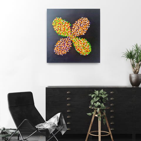 Motivet består af organiske, overlappende former og penselstrøg, der dækker hele fladen. Billedet er kvadratisk og egner sig til ophængning i stue, opholdsrum eller kontor.