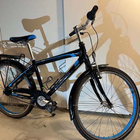 Kildemoes Bikerz børnecykel med 24" hjul i sort med gule detaljer. Cyklen har 7 Shimano Nexus gear med nyudskiftet drejegreb og nyt gearkabel. Cyklen har baglygte, bagagebærer, støtteben, lås (med 1 nøgle), ringeklokke og reflekser. Den er pudset, smurt og køreklar.