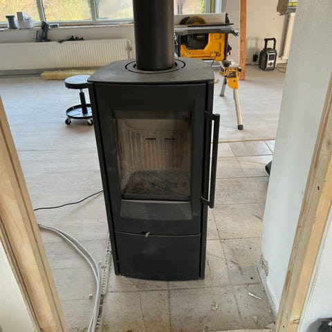 Er demonteret, glasplade til at lægge foran brændeovnen medfølger. Derudover medfølger indvendig skorsten samt beslag til at fæste denne i loftet.