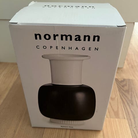 Vase, normann, Still er en elegant og klassisk vase i mundblæst glas. Essensen af Still er de to cylindriske former, der mødes i blødt buede kurver. Designet af Nick Rennie for normann-copenhagen. Vasen måler 20 cm. og er mørkegrå udvendig og lysegrå indvendig. Er helt ny. Kan sendes køber betaler for fragt eller hentes I Brønshøj.
