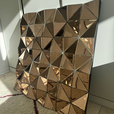 Flot og dekorativt 3D-vægspejl med et geometrisk design bestående af flere vinklede, trekantede spejlflader, der skaber en tredimensionel effekt. Mener det er fra Reflections Copenhagen.