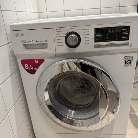 Frontbetjent model med stor rund glaslåge og rustfri tromle.
