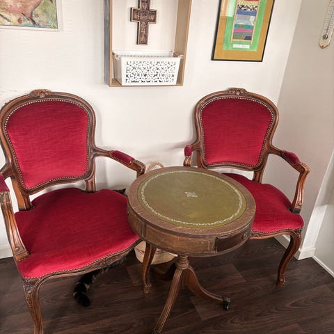 To antikke stole med broderet betræk gives væk. Det samme med kakkelbordet, der dog har flere mindre skader.