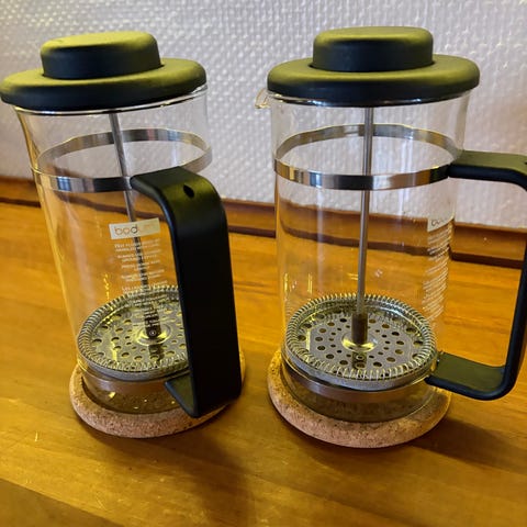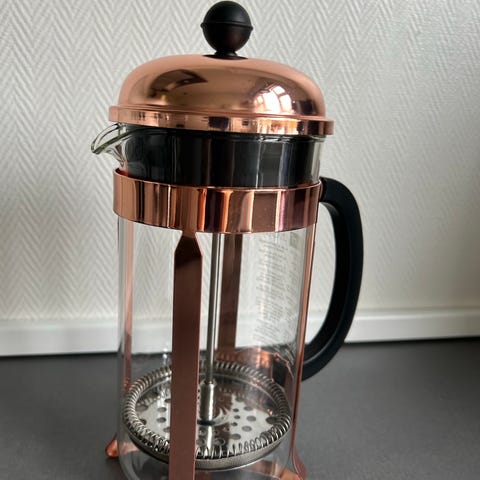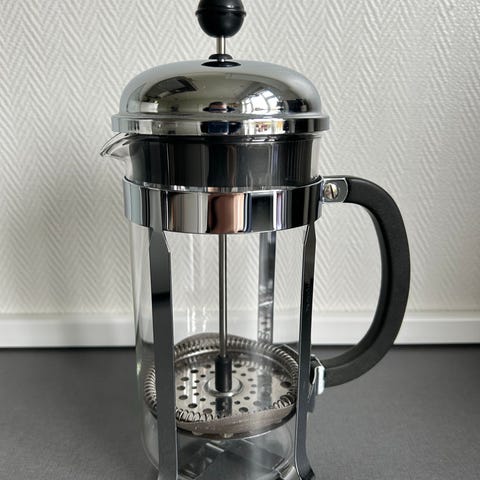Bodum stempelkande i glas med ydre holder og låg i rustfrit stål samt håndtag i plast. Velegnet til brygning af kaffe eller te ved hjælp af stempelmetoden. Genanvendelig filterløsning, hvor kaffen eller teen brygges direkte i glaskanden og presses ned med stempel. Har aldrig været brugt.