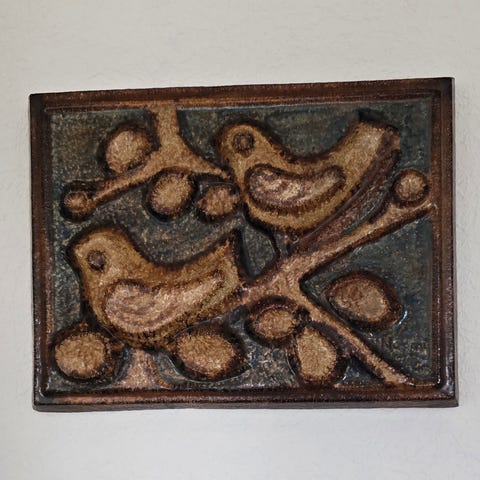Keramisk vægrelief med kvindefigur i reliefform. Motivet viser en stiliseret kvinde med blomsterdekoration omkring hovedet. Overfladen har en rustik, struktureret glasur i lyse og brune nuancer med mørke konturlinjer. Velegnet som vægdekoration i stue, entré eller andre opholdsrum. På bagsiden ses stempler fra producenten samt et håndskrevet mærke.