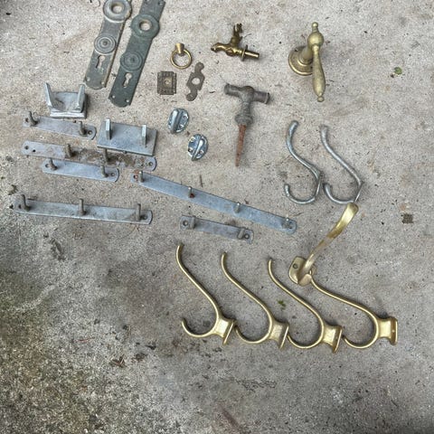 Ukendt mærke beslag til dør eller port i metal, malet røde. Sættet omfatter flere hængsler, beslag, skruer og låse-/lukketøj i samme stil. Delene kan anvendes til montering eller reparation af dør, port eller lignende konstruktion, hvor der ønskes kraftige metalbeslag. Velegnet til projekter, hvor eksisterende beslag skal udskiftes eller suppleres.