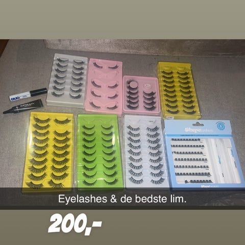 Øjenvippe-extensions til kvinder. Billederne viser forskellige typer fyldige, lange kunstige vipper på øvre vippekant. Egnet til kosmetisk brug for at give et markant og defineret udtryk omkring øjnene. Kan anvendes til både hverdags- og festmakeup afhængigt af stil og påføringsmetode.