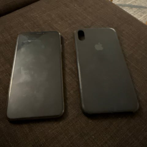 Apple iPhone XS Max smartphone med 256 GB intern hukommelse. Modellen har stor skærm med notch-design på forsiden og et kameramodul med to linser på bagsiden. Enheden på billederne fremstår i hvid farve med sort cover. Velegnet til almindelig brug som opkald, beskeder, internet, apps og foto/video.