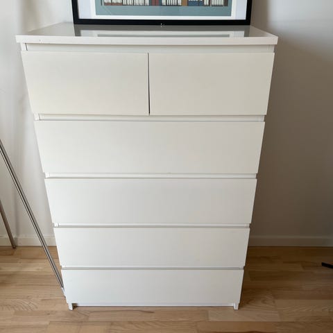Ikea malm kommode fra hjem uden røg og dyr. Der er en af fronterne mellem skufferne som har fået et slag, men kan sikkert fixes hvis man vil. Kommoden virker som den skal.