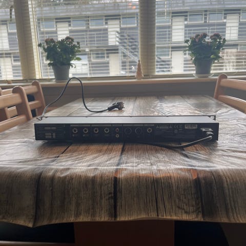 Apple lydudstyr komponent. Enheden fremstår som en specialbygget eller modificeret lydkomponent med flere drejeknapper på fronten til justering af forskellige parametre samt tilslutninger på bagsiden mærket “Out” og “Power”. Kabinettet er i metal med sort front- og bagstykke. Velegnet til brug i lydopsætninger eller som projekt-/reservedele for teknisk kyndige brugere, der kan identificere og udnytte funktionerne i enheden.