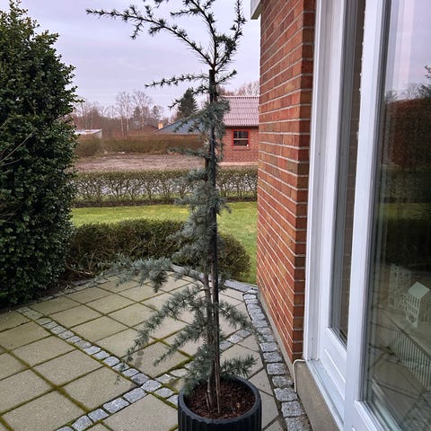 Flot træ i grå krukke. Kan tåle at stå udendørs hele året.