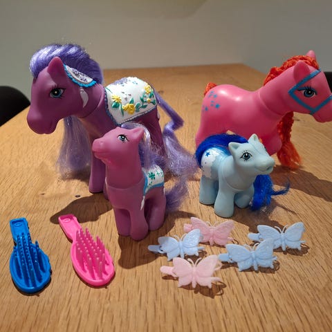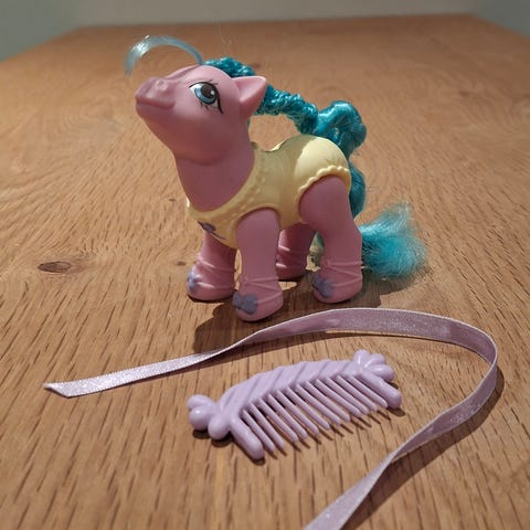 My Little Pony Baby Rainribbon (G1). Udgivet af Hasbro i 1984. Komplet med Yellow Star Comb og Ribbon. I pæn stand. Se også mine andre annoncer for andet retro legetøj.