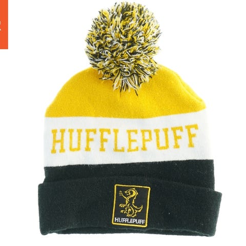 Denne hue er fra Slytherin huset fra Harry Potter serien. Den er lavet i grøn og grå farver med et emblem af Slytherin huset på forsiden. Denne hue har en kvast øverst og er strikket i et mønster med vandrette striber. Størrelsen på huen er Ø 23 cm.