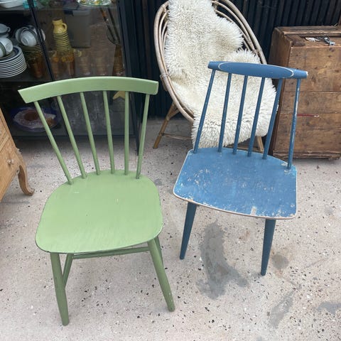 Gammel Spisebord stol i mørke grå og flet sæde 200 kr. FDB klassisk hvid tremmestol design a Poul Volther trænger til lim i tremmer derfor 200kr. Fagus børnehavestole, et klassisk dansk design fra 1970'erne, kendt for deres robuste konstruktion og holdbarhed 175kr stk.