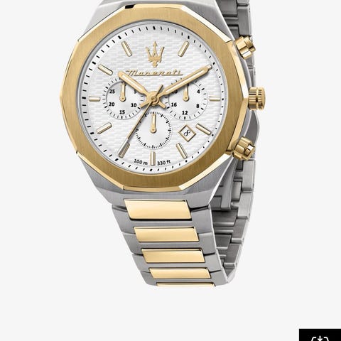 Maserati herreur med guldfarvet urkasse og metalrem samt sort urskive. Uret leveres i original Maserati-æske, som på billederne. På urskiven ses Maserati-logo og markeringer, og der medfølger et ekstra sort remstykke i æsken. Velegnet som herreur til daglig brug eller mere formelle anledninger.