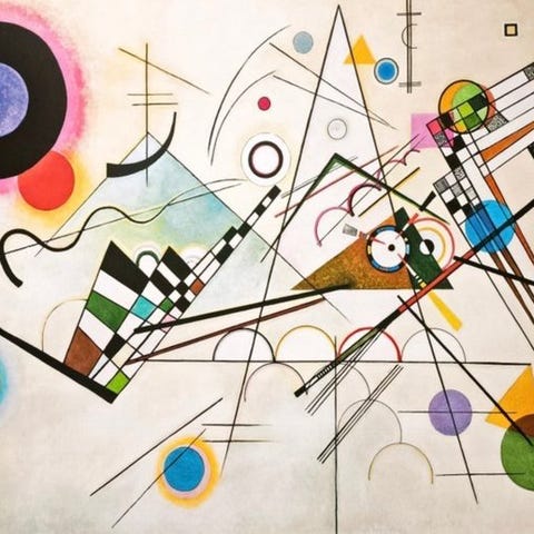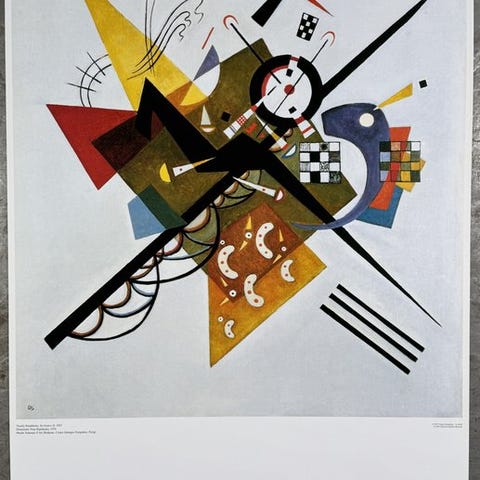 Plakat dedikeret til værket Blu di cielo af Wassily Kandinsky, en komposition hvor farven bliver rum og atmosfære. Baggrund i levende blå nuancer flyder biomorfe former og farvestrålende tegn, hængende som lette skabninger i en imaginær himmel. Helheden giver en følelse af frihed og konstant bevægelse, typisk for kunstnerens mest lyriske fase, hvor abstraktion bliver poetisk og næsten musikalsk.