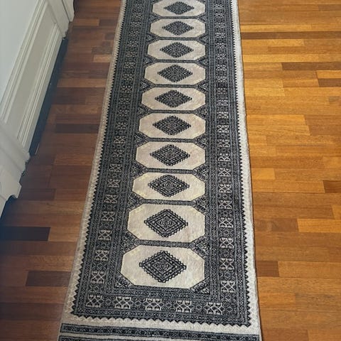 Designer Modern Rug, håndlavet i Pakistan, 237 × 77 cm, uld på bomuld, farverne grå og petrolblå, i meget god stand og professionelt rengjort. Klik på den blå "gå til varen" knap, for at købe eller byde på denne vare. Den samlede pris vil blive vist inden du afgiver dit bud.