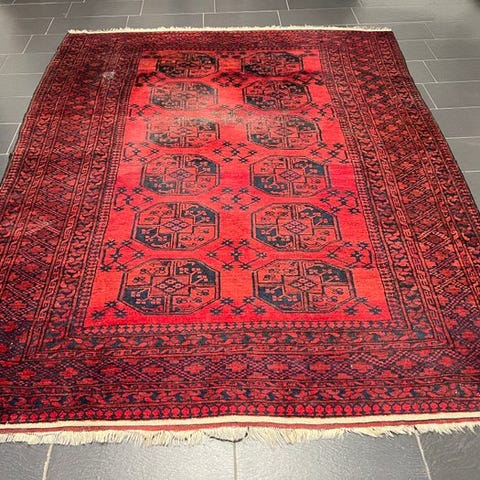 Håndvævet afghansk Art Deco tæppe fra Afghanistan, materiale uld på bomuld, måler 380 × 185 cm, vægt 26 kg. Klik på den blå "gå til varen" knap, for at købe eller byde på denne vare. Den samlede pris vil blive vist inden du afgiver dit bud.