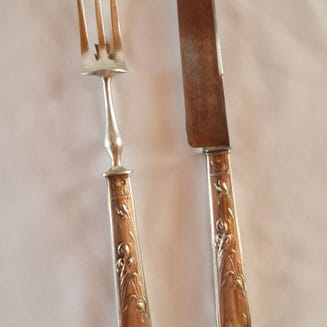 Metalldelen består af et udskaffet greb, dekoreret med løvverk, skaller og roser øverst