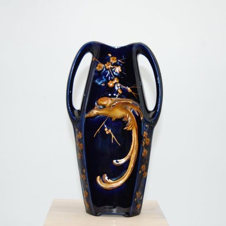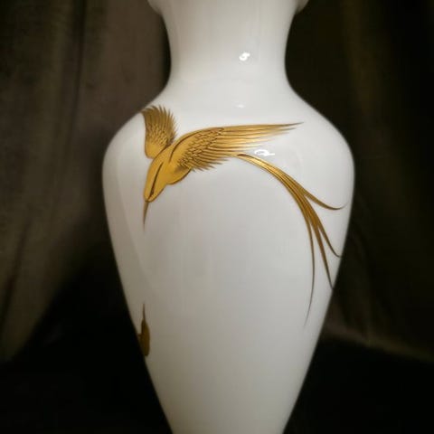 Porcelæn vase Feuervogel fra Manufaktur Chiemsee, designet af Böll, i Art Deco-stil, Tyskland, cirka 1960–1970, biscuitporcelæn, 17 cm bred, 21 cm høj, 17 cm dyb, diameter 8 cm, vægt 670 g, i god brugt stand med mindre aldersspor. Klik på den blå "gå til varen" knap, for at købe eller byde på denne vare. Den samlede pris vil blive vist inden du afgiver dit bud.