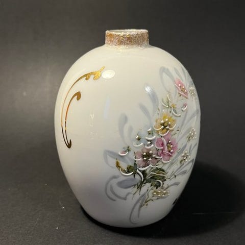 Trekantet sæt af Limoges-porcelæn med håndmalede blomster på en dyb koboltblå bund, bestående af en suppeterrine med låg og to koordinerede vaser, monteret med hamret bronze og forgyldte relieffer, i antik Louis- XVI-stil, dateret til 1940–1950, oprindeligt fra Frankrig. Klik på den blå "gå til varen" knap, for at købe eller byde på denne vare. Den samlede pris vil blive vist inden du afgiver dit bud.