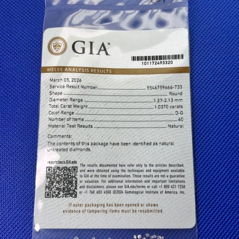59 naturlige runde briljant-melee diamanter, samlet vægt 0,8038 ct, farveområde D–G, klarhed VVS1–VVS2, GIA Melee Analysis-rapport 101169311327, forseglet i tamper-sikret emballage. Klik på den blå "gå til varen" knap, for at købe eller byde på denne vare. Den samlede pris vil blive vist inden du afgiver dit bud.