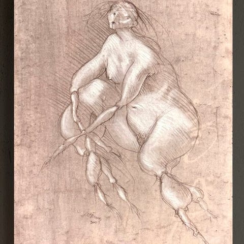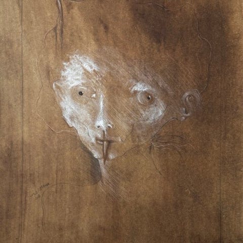 Teknik : Maleri og tegning på karton med røde pigmentglans