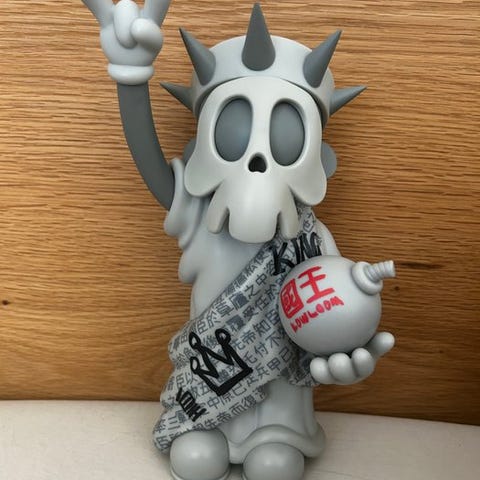 Zcwo Liberty Dead - The King, et begrænset udgave af blandet medie-kunstværk (vinyl, PVC med magnetisk maske) fra Hongkong, 27 cm højt, underskrevet på pladen, i fremragende stand, solgt af Galleria. Klik på den blå "gå til varen" knap, for at købe eller byde på denne vare. Den samlede pris vil blive vist inden du afgiver dit bud.