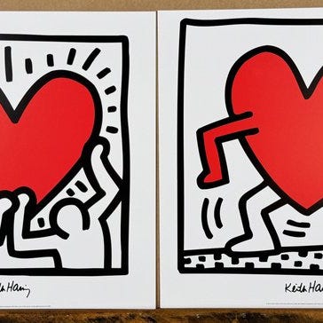 Plakat, der forestiller to stiliserede figurer i færd med at løfte et stort rødt hjerte, et af Keith Haring’s mest ikoniske motiver. De tykke sorte streger og hjertet i midten repræsenterer universel kærlighed, solidaritet og den livsenergi, som kendetegner kunstnerens poesi.