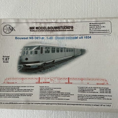 NK MODELBOUW STUDIO'S Byggesæt NS OmBC motorvogn serie 2901-2908 (1940-1950), olivengrøn med røde striber på fronten og et mørkgråt tag samt sølvfarvede skørter (mørkt tag på grund af krigsrisiko)