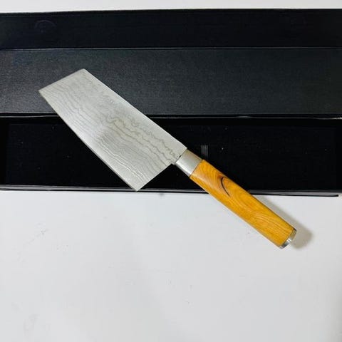 Dette er en bemærkelsesværdigt smedet og håndfremstillet køkkenkniv fremstillet af de fineste knivmager fra USA. Dette er en meget flot håndlavet serbisk tung køkkenkniv til hakning, høj kulstof, smedet stål, rosentræ håndtag, multilags smedet stål, læderskede. Kniven har et behageligt greb. Bladet er af særligt smedet stål med en høj skærekant. Denne kniv er såvel en samlergenstand som et nyttigt køkkenredskab. De længste knive har en cirka 32 cm længde.