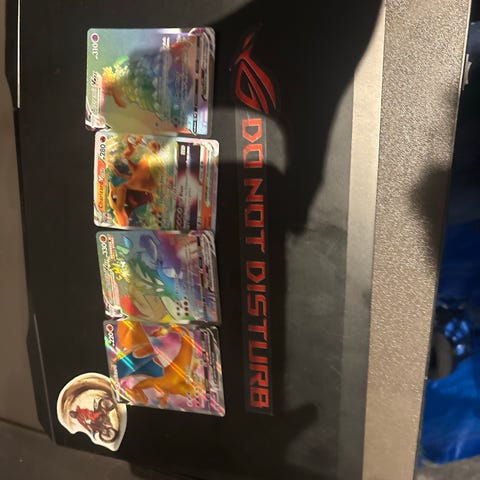 Pokémon VMAX kort lot med 5 stk holografiske samlekort. Kortene er officielle Pokémon Trading Card Game kort med VMAX-motiver. Bagsiden viser standard blå Pokémon TCG design. Egnet til samling eller som supplement til eksisterende Pokémon-kortsamling.