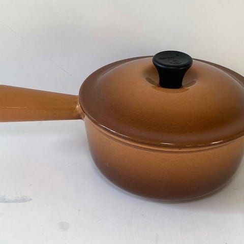 Ægte lille dækkgryde i emaljeret støbejern fra Le Creuset, historisk fransk virksomhed, verdens reference inden for kogegrej i emaljeret støbejern.