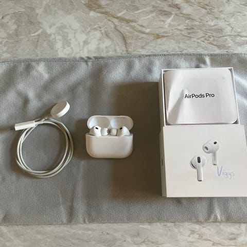 Apple AirPods Pro headset i hvid. Trådløse in-ear høretelefoner med opladningsetui. Velegnet til brug med Apple-enheder via Bluetooth-tilslutning. Leveres med etui, som fungerer som opbevaring og oplader til høretelefonerne.